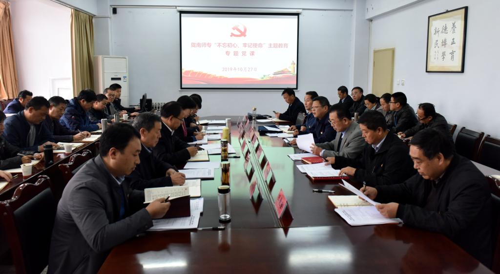 余学军围绕“不忘初心、牢记使命”主题教育总体要求,结合个人学习和前期调研,回顾了中国共产党人的初心和使命,回顾了学校从革命战火中走向伟大新时代的艰苦历程,着眼于新时代师范教育改革和发展面临的新形势和新任务,从“初心和使命”的源头、重大意义和高等教育“培养什么人,为谁培养人”深刻阐述了陇南师专如何在新时代续写初心和使命的历史重任。