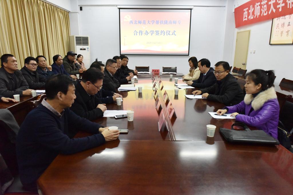田澍还就如何推进两校务实合作,提出了三点希望:一是高度重视,高标准定位学院发展。要秉承先进办学理念,高标准定位,敢于担当,勇于创新,努力把学院建设成为教育教学、研究教育创新的实验高地,形成标志性办学成果。二是创新模式,高质量推进人才培养。两校相关学院和职能部门要科学制定专业建设规划和人才培养方案,创新培养模式,完善教学组织机构,选派优秀教师和干部严格按照培养标准完成教育教学工作和学生管理工作,确保教育教学质量,推动学生高质量就业。三是相互学习,高水平拓宽合作领域。要做好教师发展规划,对聘用教师进行有计划的培训和研修,通过攻读硕士、博士学位,共同组建科研团队等方式,加强协作,不断提升教师的能力与水平。同时两校要相互学习,不断拓宽合作领域,助力国家“一带一路”倡议实施举措的实践与研究;深化在甘肃华夏文明的传承、地方文化研究等方面的合作与交流,提高基础研究和应用研究水平。
