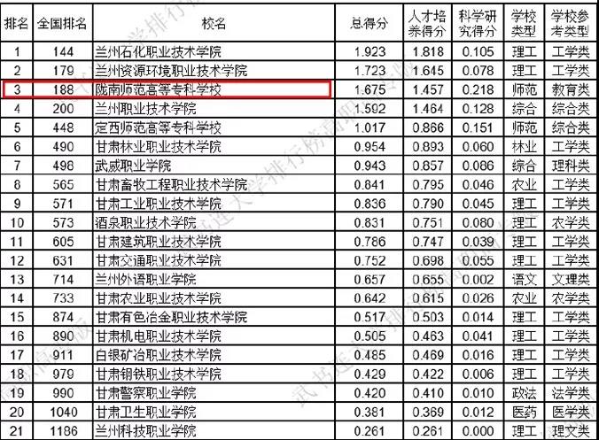 武书连2019中国1200所高职高专分省排行榜(甘肃)