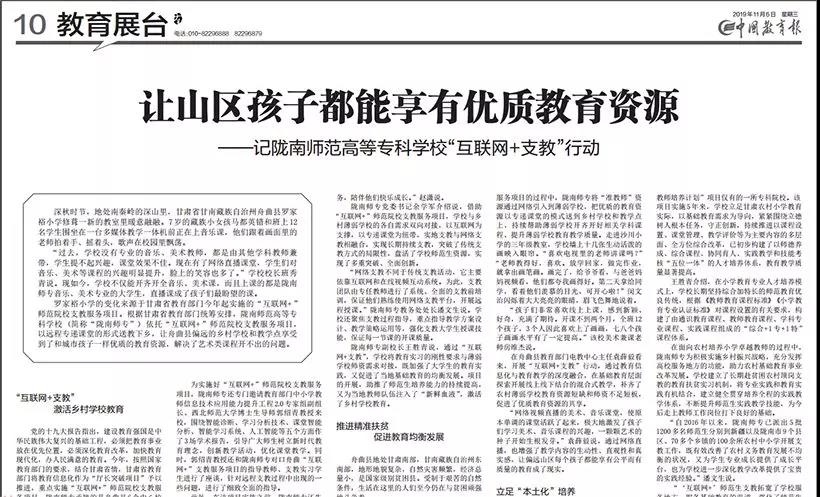 《中国教育报》以《让山区孩子都能享有优质教育资源——记陇南师范高等专科学校“互联网+支教”行动》为题报道了beat365实施“互联网+”师范院校支教服务项目,对口支援甘南藏族自治州舟曲县基础教育发展的成功经验,得到了中组部、教育部的肯定。