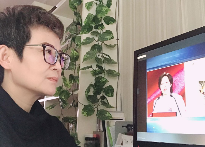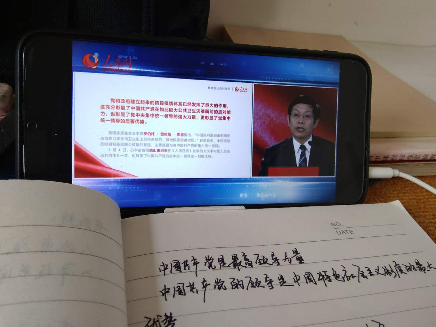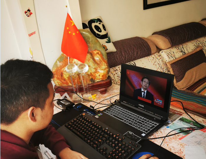 为了观看这堂特别的思政课,农林技术学院令海鹏同学专门在自己的电脑旁插了一面五星红旗,马克思主义学院尚琴同学拿着手机在寒风中坐在院子里观看了近两个小时,还有的同学去邻居家蹭网学习......