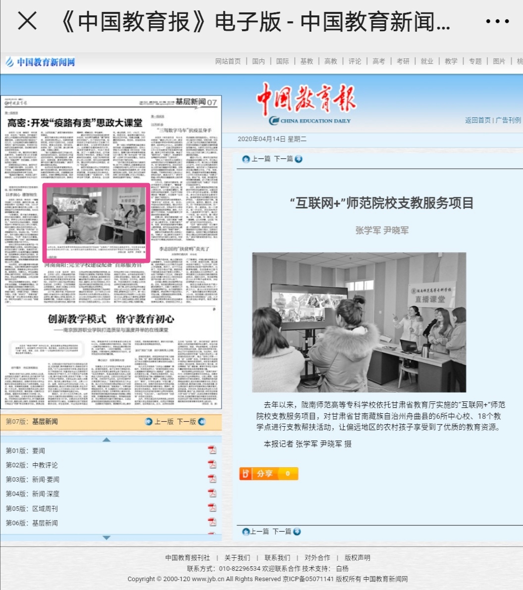 4月14日,《中国教育报》第7版(基层新闻)、第10版(职教周刊)同期刊发了该报记者张学军、尹晓军采写的beat3652条图片新闻,题目分别为《“互联网+”师范院校支教服务项目》和《陇南师专:理实结合培养学前教育专业人才》,有力地宣传了beat365在服务乡村教育发展、培养高素质人才等方面取得的新成绩,极大地提升了学校的影响力和知名度。