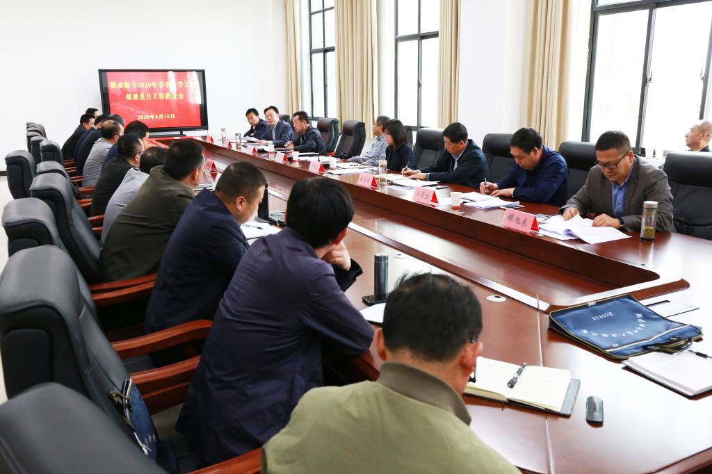 5月12日下午,学校在图书馆三楼会议室召开2020年春季开学工作部署及月推进会。党委书记余学军,党委副书记王莹成,副校长任永峰、王胜青、王录全、张勇,纪委书记、监察专员镡旭东出席会议。校长李艳红主持会议。