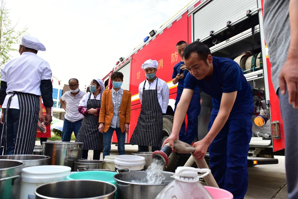 5月31日上午,成县消防中队主动出动6吨水罐消防车为学校送水,解决突然停水带来的生活困难。看着洁净的自来水装满一个又一个盆和桶,餐饮工作人员脸上紧皱的眉头也舒展开来,高兴地对官兵说:“真是太感谢你们了!要不是你们及时给我们送来水,今天6千多名师生的伙食就没保障了。”(图文/宋溦)