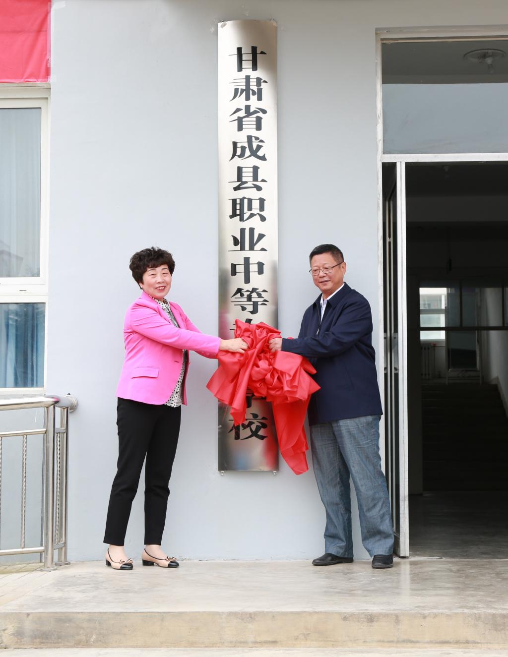 余学军与周华共同为成县职业中专揭牌。