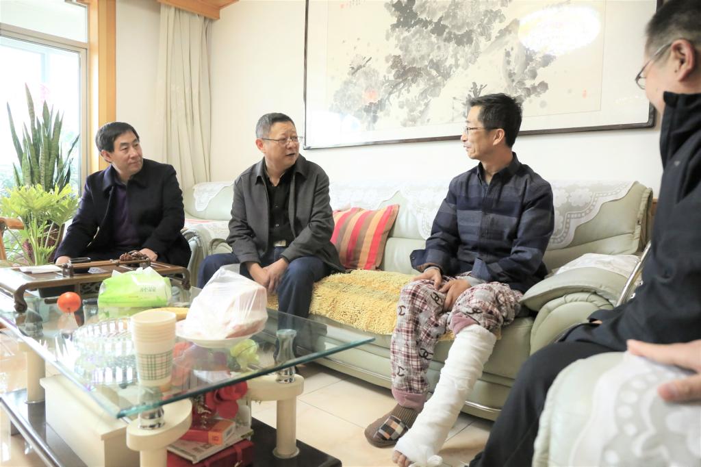 在薛海峰家中,余学军详细地询问其伤情和治疗情况,并送去了慰问品,感谢他代表学校在比赛中所作的努力,叮嘱他要保持积极乐观的心态,好好养伤,争取早日康复。