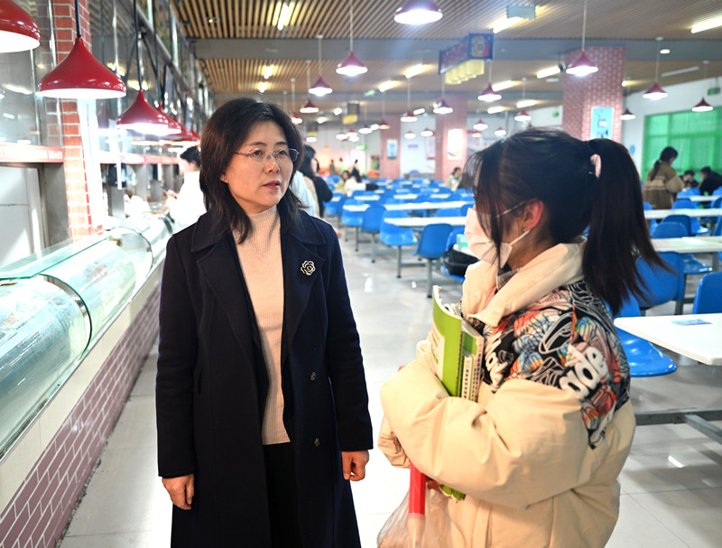 在学生餐厅,李艳红同就餐的同学们进行了亲切交流,详细了解了饭菜价格、质量等情况,并提醒同学们自觉养成良好的卫生习惯,加强个人防护。