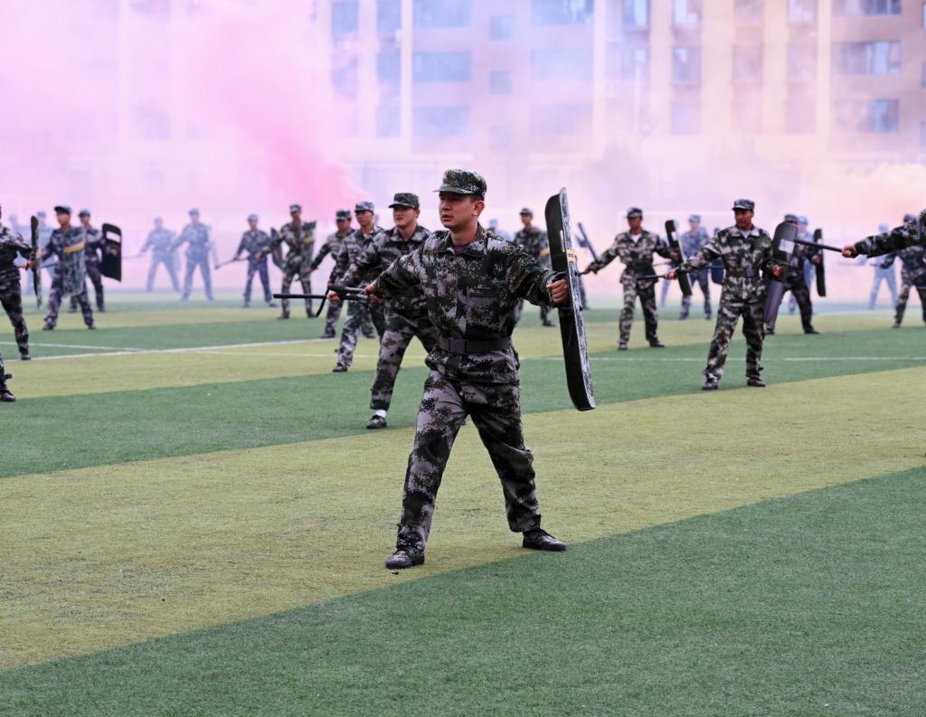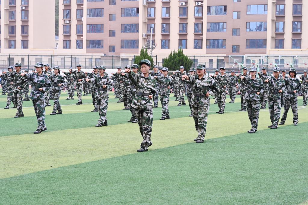 分列式结束后,特色科目表演轮番登场,将大会气氛推向高潮。花式队形方阵以饱满的精神展现团队协作之美;刺杀操方阵动作迅猛,尽显军人血性;擒敌、警棍盾牌操方阵招式精准有力,展现出过硬的技能素养;战术方阵模拟实战场景,灵活机动;教官倒功操方阵更是以干净利落的动作,诠释了军人的过硬本领。现场呐喊声、掌声此起彼伏,每一个节目都彰显着陇师学子奋发昂扬的斗志与永不言弃的精神。