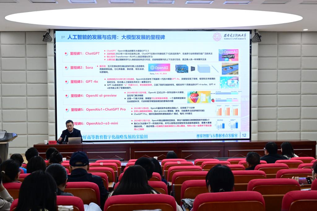 开幕式后,广西师范大学唐素勤教授、兰州大学马志新教授、陇东学院王璇副教授、北京超智能科技有限公司CEO杨建刚、西安电子科技大学苗启广教授、西北师范大学田冉副教授、超星泛雅集团高级教学设计师刘婷婷、北京宇乐树科技有限公司CEO侯雪君先后作了题为“人工智能赋能课堂教学变革”“基于国产大模型的应用创新途径”“生成式人工智能驱动乡村教师专业发展——以DeepSeek为例”“基于AI+X垂直领域学科大模型建设的人工智能教育解决方案”“AI赋能教育 数据驱动未来”“人工智能赋能教师教育:挑战、机遇与路径”“顶层设计 协同发展——AI赋能专业课程智慧升级”“AI赋能高校就业新形态”的学术报告。