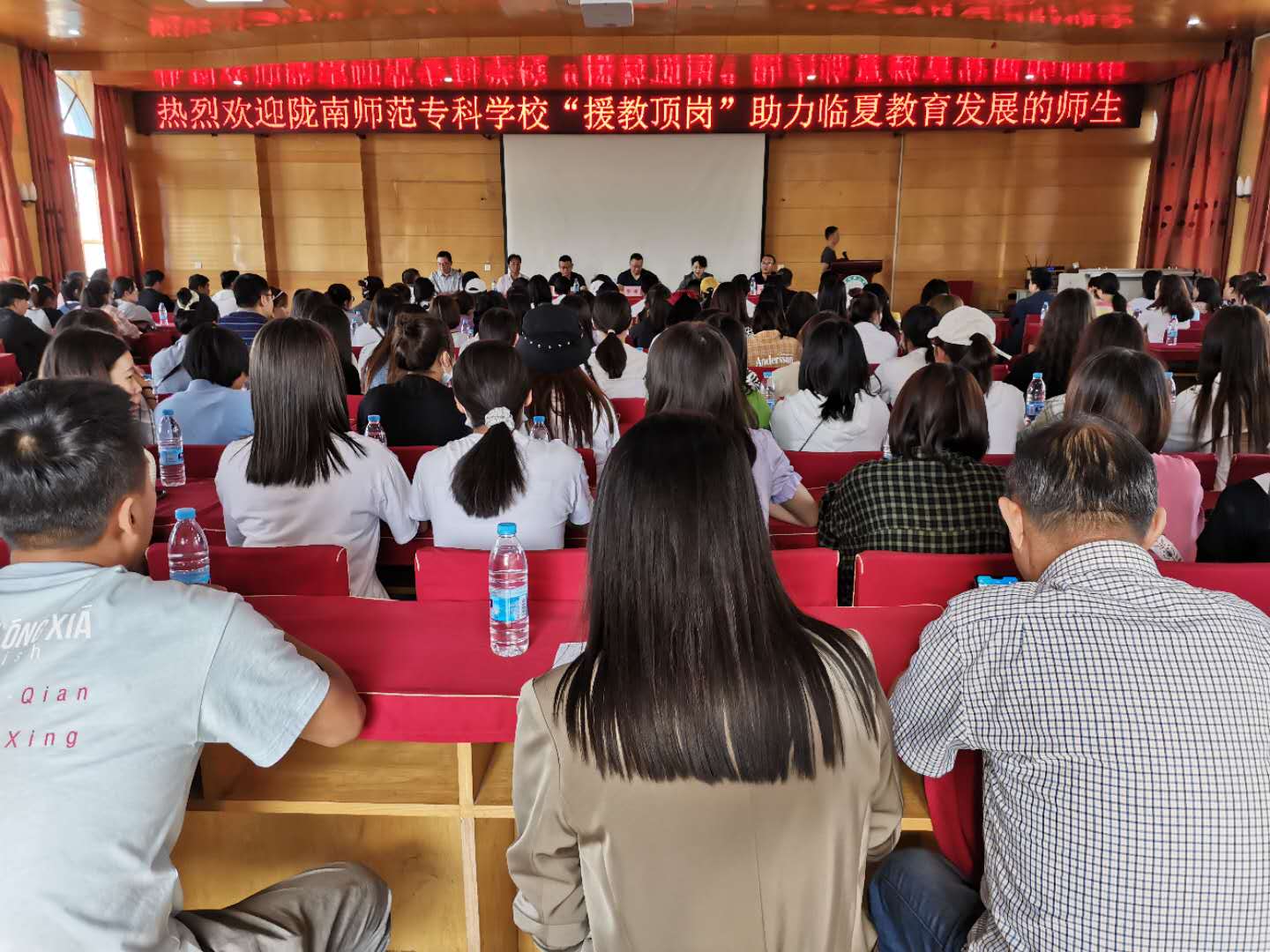 在报到现场临夏市第二中学,市教育局召开欢迎会暨支教培训会。市教育局副局长马燕芳代表临夏市教育局对beat365师生来该市援教顶岗表示衷心感谢,并介绍了该市的教育方面的基本情况,对援教老师提出了具体要求。教务处负责人、指导教师参加了会议。