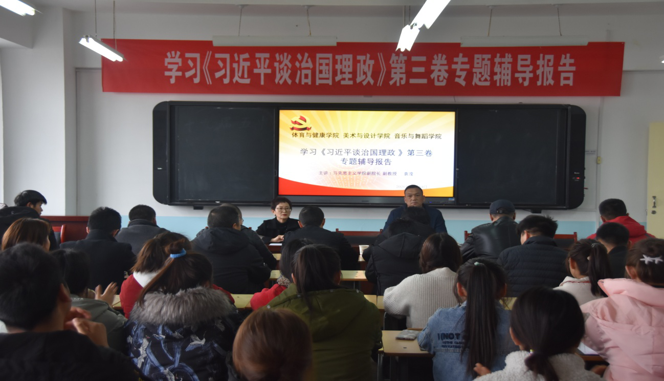 11月24日下午,美术与设计学院、体育与健康学院、音乐与舞蹈学院邀请马克思主义学院副院长袁滢副教授作学习《习近平谈治国理政》第三卷专题辅导报告。三个学院的领导班子、党员教师、入党积极分子、学生干部代表共计150多人参加了辅导报告会。辅导报告会由体育与健康学院党总支书记汪贵文主持。